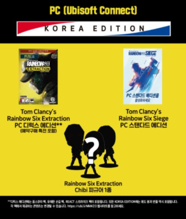 가격은 정가 55,000원으로, 특전 에디션치고는 착한 가격이라고 생각됩니다. PC 플랫폼 같은 경우는 익스트랙션 본편의 디럭스 에디션을 포함, 레인보우식스 시즈 스탠다드 에디션도 증정한다고 합니다. 여기에 더해서 피규어도 1종도 랜덤으로 준다고 하네요.