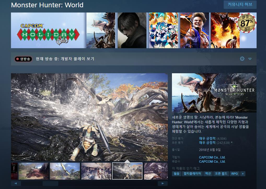 특히, 양산형 RPG 게임이나 반복되는 방식의 온라인 게임에 지쳐버리게 되었다면 몬스터 헌터 월드를 플레이 해보면 좋을 것 같은데요. 이 게임도 마찬가지로 반복되는 메커니즘이 존재하기는 하지만 그 안에서 느껴볼 수 있는 해당 게임만의 재미가 확실히 보장되어 있으니 염려하지 않으셔도 됩니다. 더불어, 관련된 시리즈 대부분이 고평가를 받고 있는 만큼 2025년에 등장할 후속작도 확정된 상태인데요. 이처럼 이들이 성공할 수 밖에 없었던 이유를 한 번 느껴봅시다! 스팀 세일 페이지 바로가기