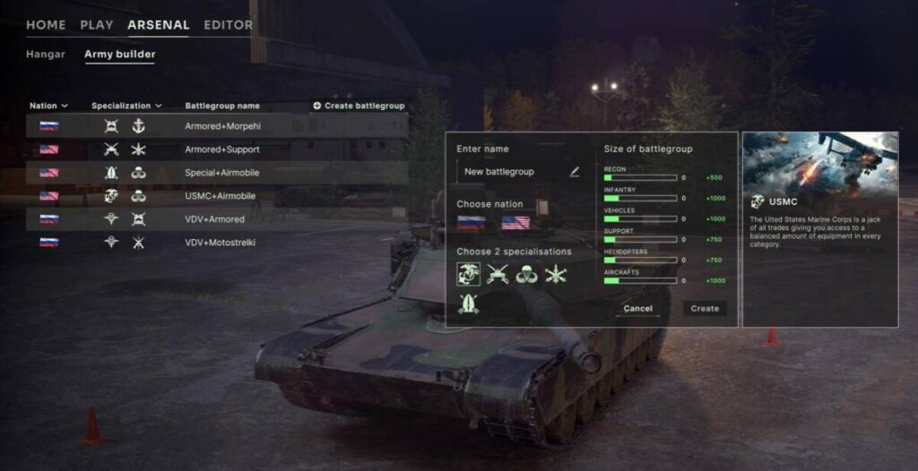 기갑 부대에 공수 특성을 활성화 한다거나, 해병 특성을 활성화 하는 방식으로 본인만의 유닛을 구성할 수 있습니다. 위 사진 같은 경우 기갑 부대에 해병 특성을 활성화 한 것인데요. 이에 따라서 활용 가능한 자원이라던가 무기 같은 것들이 변경되곤 합니다.