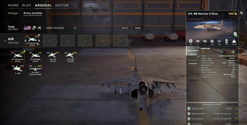 덕분에 몇 기 되지 않지만 공중 화력 지원을 위해 사용할 비행기를 고를 수가 있는데요. 위 사진에서는 AV-8B 해리어 2 입니다. 이외에도 호넷이라던가 F35B 등을 살펴볼 수 있는데요. 정식 출시 된 이후에 업데이트 되면서 다른 유닛들도 등장하지 않을까 생각되는 부분입니다.