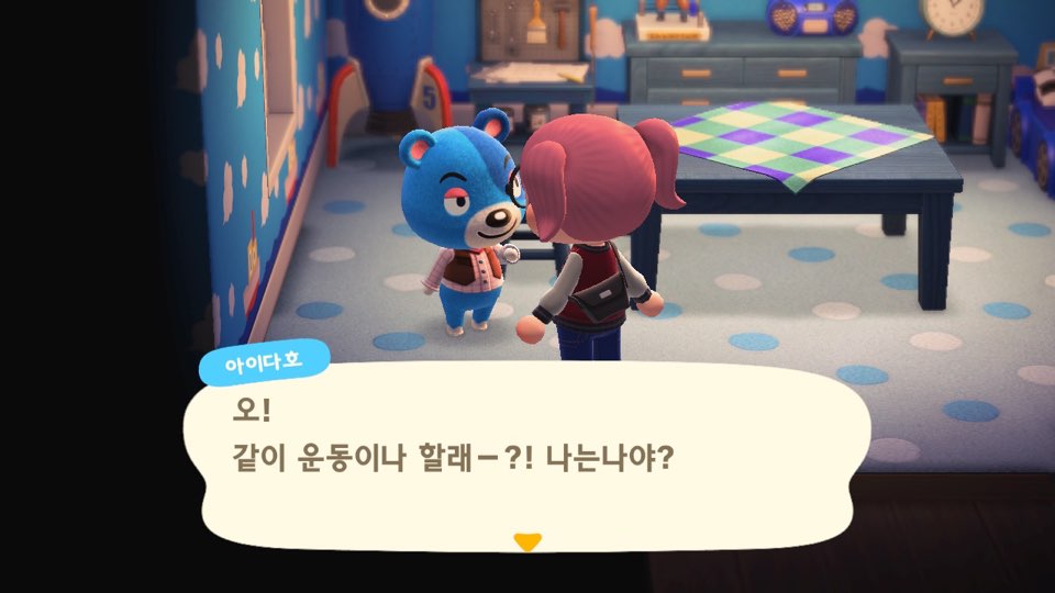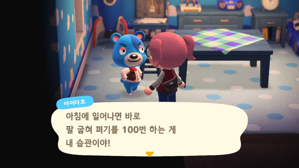 재미있는 디테일로는, 다른 주민들이 운동을 할 때 들고 있는 아령은 크기도 작고 들어올리는 속도도 느리지만 운동광 주민이 들고 있는 아령은 훨씬 크고 들어올리는 속도도 빠르다고 해요. 플레이어에게 인사할 때 두 손을 흔들어 인사하는 것도 특징 중 하나.