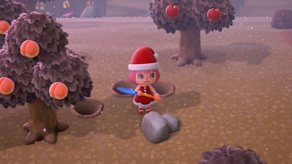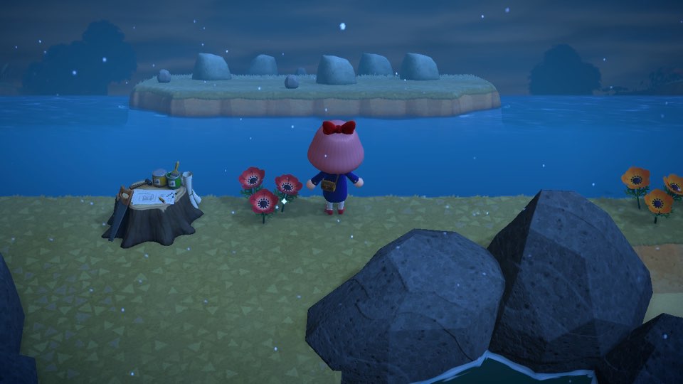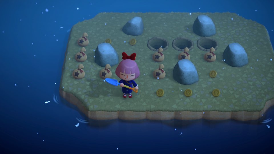 바위 섬에 도착하면 최대 효율을 위해 바닥에 떨어져 있는 작은 돌들을 모두 줍고, 돈 바위를 친 것과 동일한 방식으로 삽으로 바위를 쳐주세요. (연속 8번을 칠 수 있도록 준비 작업!)
