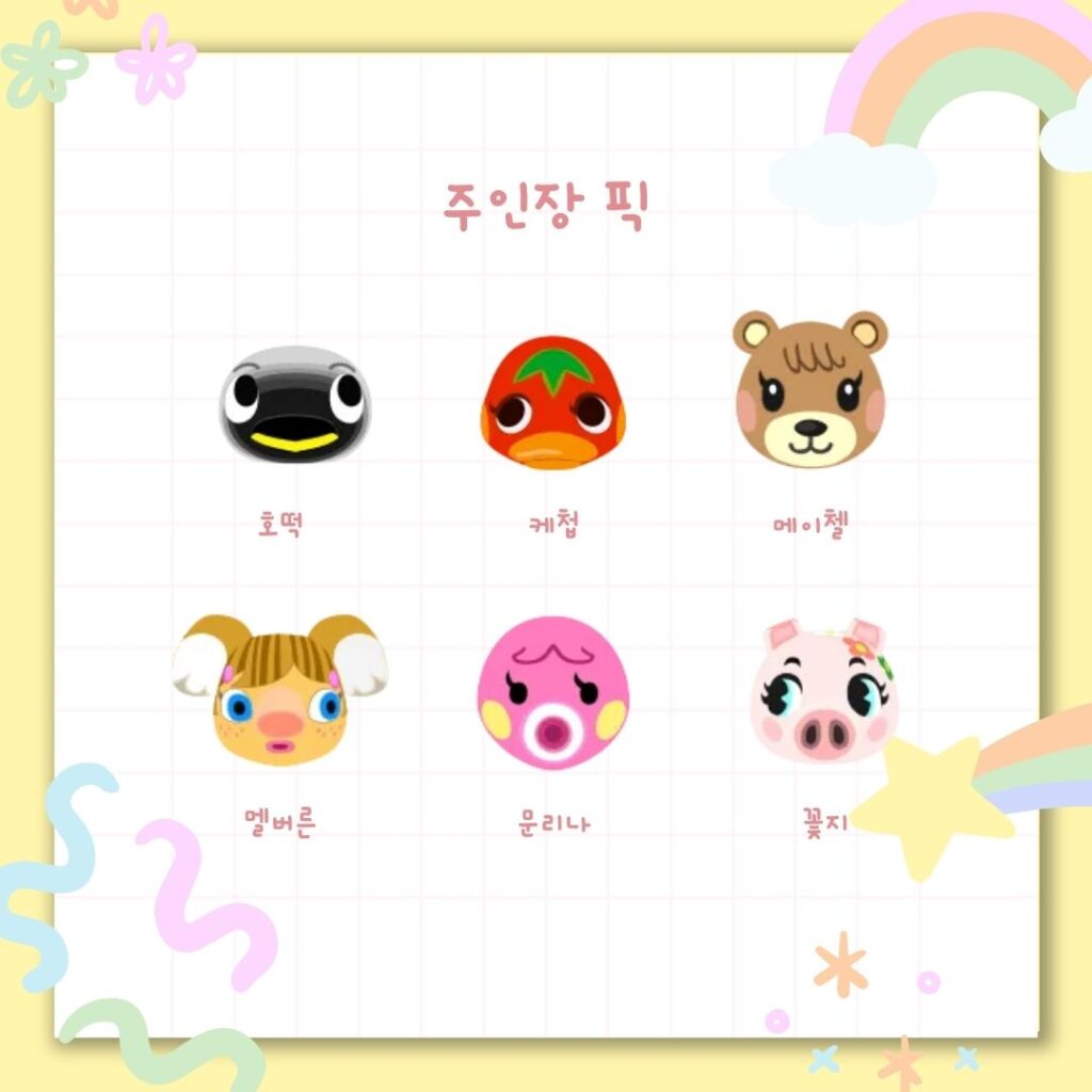 이대로 끝내기는 아쉬워 에디터의 픽들을 모아보았는데요! 최대한 순위에 없던 주민들로 구성해보려 했으나 최애 메이첼만은 포기하지 못하고… ㅎㅎㅎ 같이 모아보았습니다.