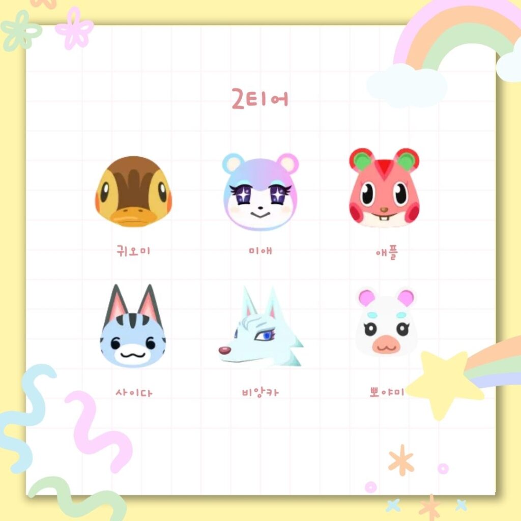 아쉽게 밀려났지만, 여전히 인기가 많은 2티어 주민들입니다. 미애, 애플, 뽀야미 모두 1티어까지 올라갔을 만큼 인기가 많은 주민들인데요.