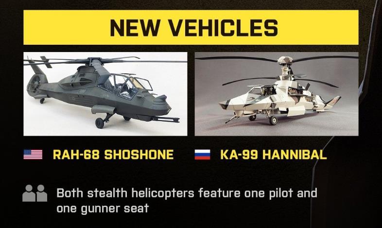 양측 진영에 최신식 스텔스 헬기가 추가됩니다. 기존과 동일하게 파일럿과 거너로 구분되어 있는 2인 조종기로 등장합니다. 앞으로 있을 교전의 양상을 바꿀지에 대해서는 잘 모르겠습니다. 지금까지는 헬기가 전장을 장악하는 경우가 많았기 때문에, 헬기가 또 추가 되는 것이 맞는지도 의문이네요.