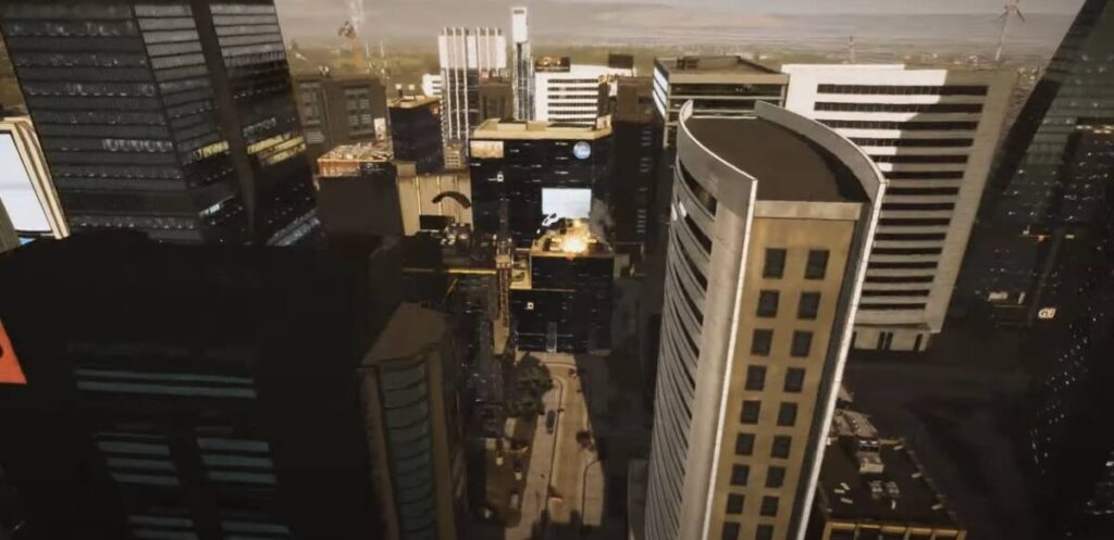 낙하산을 전개하면서 시작지점을 향해 가는 유저가 작게 보입니다. 건물들이 높게 자리 잡은 것이 마치 배틀필드 4의 맵을 연상케 하는데요. 곧 다가올 여름과 잘 맞는 맵이라고 생각됩니다. 이 도시를 강타한 자연재해가 폭풍이나 홍수 같은 ‘몰아치는 시원함’ 을 연상케 하기 때문일까요? 물론 무서운 것들이지만 게임 속에서는 무드로써 작용하기에 시원한 느낌이 드는 것은 자연스러운 것이라고 생각됩니다.