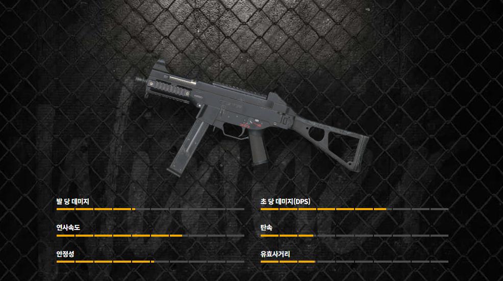 탄수급이 9mm로 되기 때문에 원래 이름이었던 UMP 45에서 UMP로 바뀌었는데요. 발당 저지력이 나쁘지 않은 총기인데다가 MP5K와 마찬가지로 풀파츠 일 때 최상의 성능을 자랑하기에 SMG 중에서는 추천할만한 총이라고 볼 수 있겠습니다.