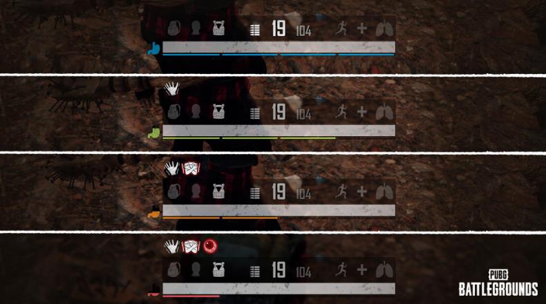 배그 좀비모드는 한층 더 업그레이드 되었기 때문에 좀비들을 처리하는 건 ‘기본’ 이 되었습니다. 왜냐하면, ‘굶주림’ 기능이 추가 되었기 때문이죠. 배고픔 게이지의 색깔에 따라서 각종 상태이상이 나타나는데요.
