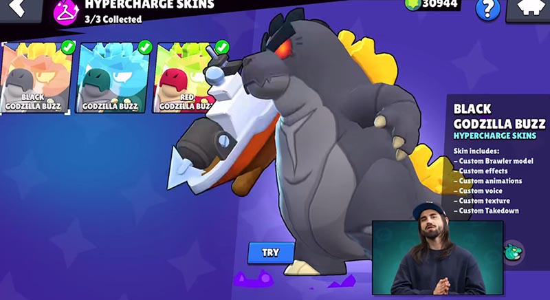 최근에 등장했던 하이퍼차지, 잘 활용하고 계신가요? 이번에 새로운 등급의 스킨, 하이퍼차지 스킨이 등장합니다. 하이퍼차지 스킨은 말 그대로 하이퍼차지 상태일 때 브롤러의 외형을 바꿔주는데요. 이번 시즌에는 한정 하이퍼차지 스킨인 고질라 버즈가 등장합니다.