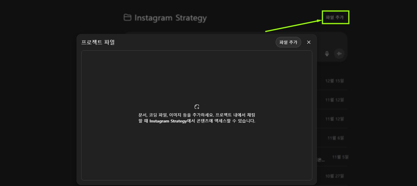 대화 세션에서처럼 프로젝트 자체에 파일을 제공하는 것도 가능합니다. 전반적인 맥락으로 삼을 수도 있고, 특정 부분에 대한 보조 지표 등으로 사용할 수도 있는 등 사용 방법은 무궁무진하죠.