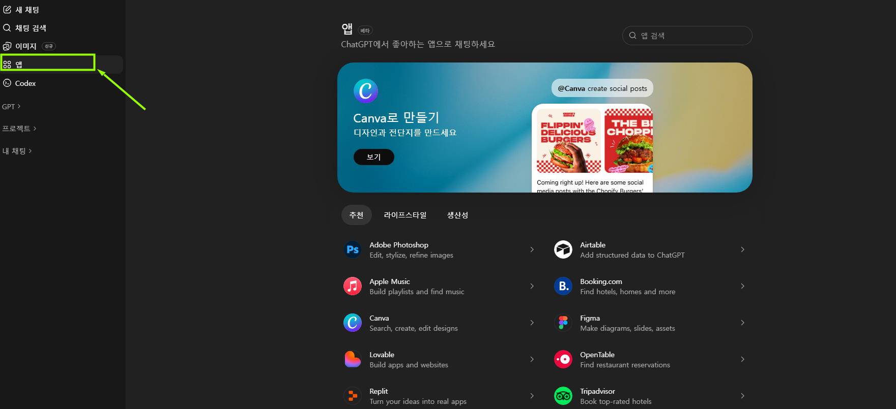 기능의 이름에서도 알 수 있듯이, 지피티와 앱을 연결하는 기능인데요. 대부분의 앱은 로그인 및 연동이 필요합니다.