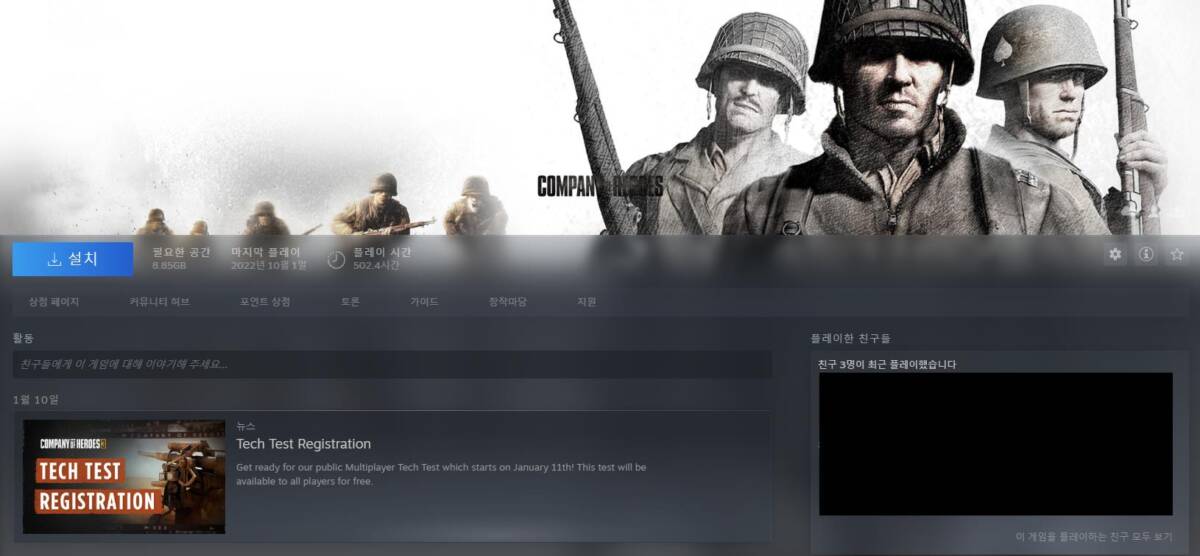 리스트에서 클릭한 뒤, 컴퍼니 오브 히어로즈 3 상점 페이지가 정상적으로 출력되면 위 사진처럼 비슷한 화면을 보실 수 있게 됩니다. 이 때 화면을 아래로 스크롤 해보시면 위 사진의 초록색 부분을 확인하실 수 있습니다. “지금 실행하기” 를 클릭하시면 자동으로 스팀 라이브러리에 추가가 되며 설치하실 수 있게 됩니다. 설치가 된 뒤에는 별도의 작업 없이도 게임을 플레이 하실 수 있기 때문에 테스트 기간을 즐기시면 될 것 같습니다.