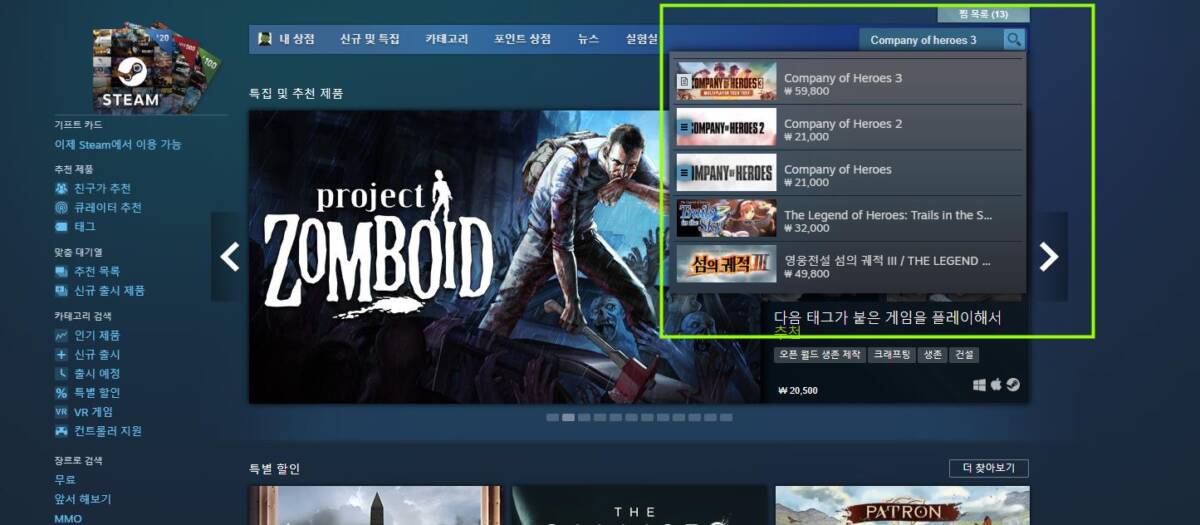 스팀 상점 창에서 “영문”으로 “Company of Heroes 3” 를 검색하시면 위 초록색 상자 안에 리스트처럼 게임들이 보이실 겁니다. 이 때 Company of Heroes 3 를 클릭해주시면 됩니다.