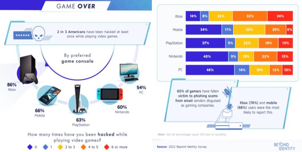 위 자료는 비욘드 아이덴티티라는 곳에서 인터뷰한 자료입니다. 왼쪽에 점수와 오른쪽 그래프를 비교해서 보시면 아시겠지만, PC에 비해서 콘솔 유저들이 상당히 많이 해킹되고 있는 것을 보실 수 있습니다.