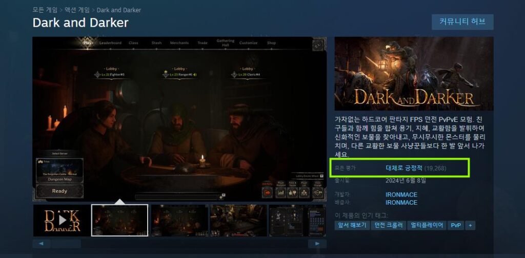 유저 평가를 보면 나쁘지 않은 게임이라고 해석해볼 수 있습니다. 2만 개 정도가 되는 리뷰가 생성되었는데, 모두 종합해보면 ‘대체로 긍정적’에 해당하는 지표를 보이고 있기 때문이죠.