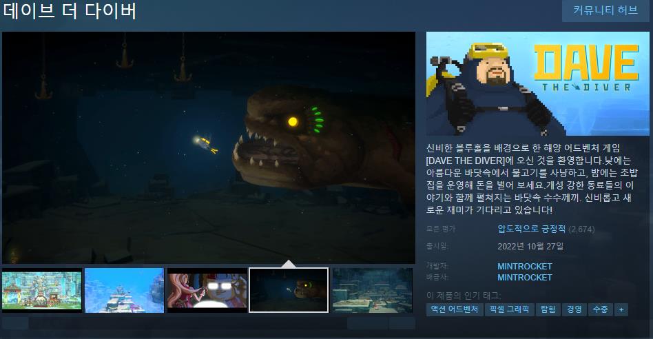 출시일인 10월 27일부터 11월인 지금까지 계속해서 압도적으로 긍정적이라는 평가를 이어가고 있는 스팀 게임이 있었으니, 그 이름은 바로 데이브 더 다이버 입니다. 여전히 대규모 게임사들의 작품들이 시들시들한 현 상황에서는 최신작 중, 재미있고 작품성이 뛰어난 게임을 찾기가 조금은 힘든 상황인데요. 때문에 이 게임을 추천하지 않을 수가 없었습니다.
