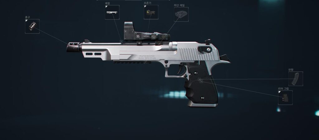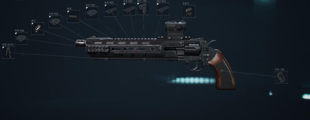 데저트 이글과 마찬가지로 위력은 강하지만 연사력이 느린, 딜레이가 존재하는 권총입니다. 이 권총 같은 경우 배럴을 교체했을 때 상당히 많은 부품 부착이 가능한데요. 때문에 강력한 한 방을 도모하는 장거리 리볼버로 만들 수도, 예능을 위한 ‘고인물 총기’로도 활용이 가능합니다.