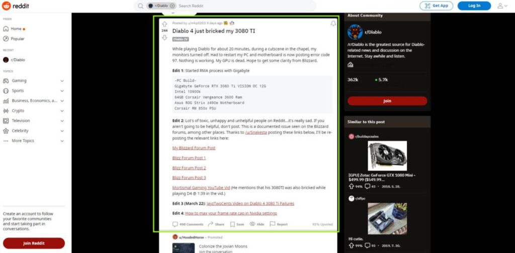 마찬가지로, 블리자드 또한 현 상황에 대해서 게임 상에는 문제가 없는 것으로 보인다는 이야기를 할 뿐 자세한 이야기는 없는 상태인데요. 현재 이러한 케이스의 대다수가 기가바이트 사의 RTX 3080 Ti 라는 점을 미루어 보아, 해당 그래픽카드를 사용하시는 분들은 디아블로 4 구동시 각별한 주의가 필요할 것 같습니다.