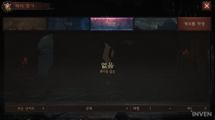 디아블로 이모탈에서는 세트효과 능력치를 적용받는 보조 장비를 습득하기 위해서 던전 플레이라는 콘텐츠를 이용해야 한다. 보다 좋은 아이템을 위해서는 더 난이도 높은 던전을 공략해야 하는 것이 당연지사! 상위 난이도의 던전은 싱글플레이로 공략하기 어려운 점이 있어 지옥 1 난이도부터는 파티플레이로 진행해야만 하는데 여기서 문제가 발생한다. 생각보다 던전 콘텐츠를 이용하는 유저가 없어 파티가 잘 잡히지 않는다는 것.
