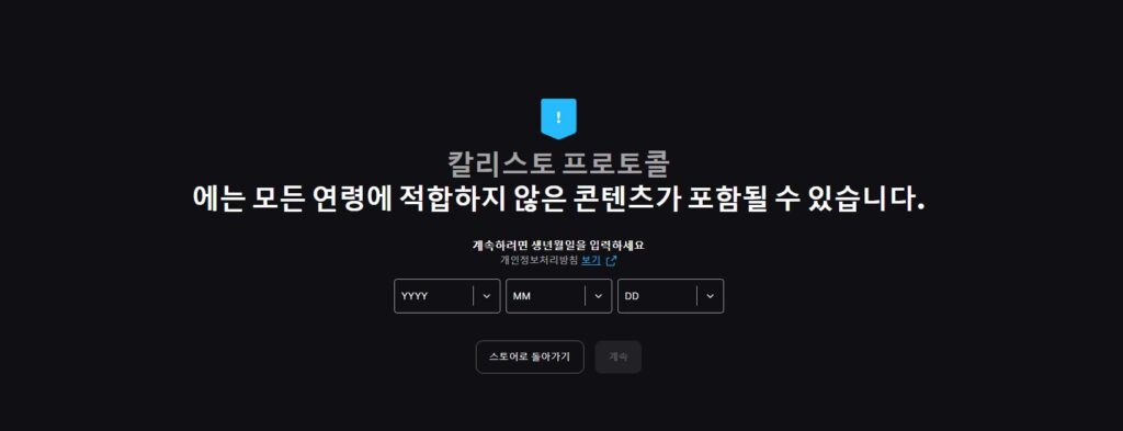 오늘 소개해 드릴 게임들 뿐 아니라 어떤 게임을 무료로 받을 때에 주의해야할 점이 있습니다. 그것은 심의 등급과 관련된 내용인데요. 예시로 오늘 소개하려는 게임 중 하나, <칼리스토 프로토콜>은 청소년이용불가 등급 판정을 받은 게임이기 때문에 페이지 접속부터 유저의 나이를 체크합니다.