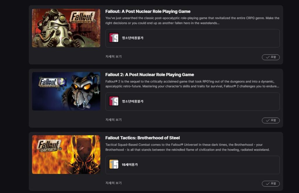 이들 모두 긍정적인 리뷰가 많이 뒤따르는 게임들이고 특히 폴아웃 1 같은 경우 출시 후 오랜 시간이 지났음에도 불구하고 ‘압도적 긍정적’을 받는 게임인데요. 구매하여 플레이 해도 될 정도이니까 믿고 무료배포 받으시길 추천드립니다.