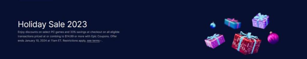 사실 이러한 행사는 매년 꾸준히 시행되고 있었는데요. 올해도 어김없이 12월 20일부터 매일 게임을 배포할 것이라고 합니다. 이번 2023 에픽게임즈 무료배포 행사는 1월 3일까지 진행되며, 매일 다른 게임들이 무료로 배포될 예정이라고 하는데요. 이번에는 어떠한 게임들이 준비되어 있을지 큰 기대가 가득하네요. 거기에 더하여 홀리데이 세일 역시 2024년 1월 10일까지 진행됩니다. 넉넉한 시간이 준비된 만큼 연말연시를 책임져줄 게임을 심사숙고하여 고를 수 있을 것 같습니다.