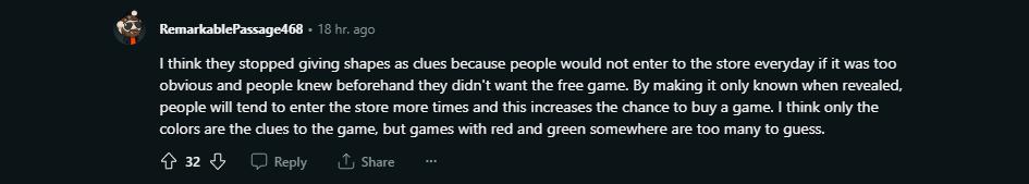 한국에서는 에픽게임즈의 이번 무료배포와 관련하여 여러 가지 이야기가 활성화 된 편은 아니라서 해외 커뮤니티인 레딧의 반응을 가져와 보았는데요. 가장 많은 좋아요를 받은 댓글을 하나 가져와 보았습니다. 그의 추측에 따르면, 이전까지는 에픽게임즈 무료배포가 있을 때마다 어떤 게임이 다음에 공개되는지에 대해서 미리 했던 것에 반해 올해부터는 최소한의 정보만을 주어 어떤 게임이 다음 배포 대상인지 추측하게 만들었다고 하는데요.