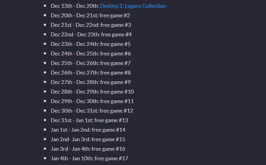 에픽게임즈의 이번 무료배포 기간은 위 사진에 나와있습니다. 하루종일 1개의 게임이 배포 된 뒤, 그 다음날에 바뀌는 형식을 취하고 있는데요. 모두 다 받게 될 경우 총 17개의 게임을 공짜로 받게 되는 것이기 때문에 상당히 좋은 기회라고 볼 수 있을 것 같네요. 1개당 한화로 3만원에 해당하는 게임이라고 가정하면 총 510,000원 어치 게임을 무료로 받는 것이 되기에 너무나도 좋은 연말연시 이벤트인 것 같습니다. 다들 놓치지 마세요!