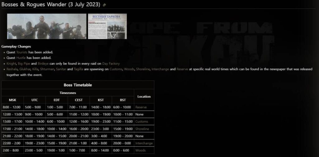 위 사진은 현재 적용된 이벤트를 보여주는 것인데요. ‘팩토리’ 라는 맵에 로그 보스가 나타나며 이외에 다른 곳에서도 보스가 나타날 것임을 알려주는 것입니다. 사실 보스는 특정한 맵, 특정한 장소에서만 나타나지만 타르코프 초기화가 임박할 때면 이벤트를 위해 여러 곳에서 흔하게 마주칠 수 있도록 스폰을 조절합니다. 그런데 중요한 것은, 저렙 유저들은 AI의 에임에 압살 당할 수 밖에 없고 스캐브로 플레이 한다고 하더라도 우호도가 낮아 지나치는 순간 죽을 수 밖에 없다는 것입니다.