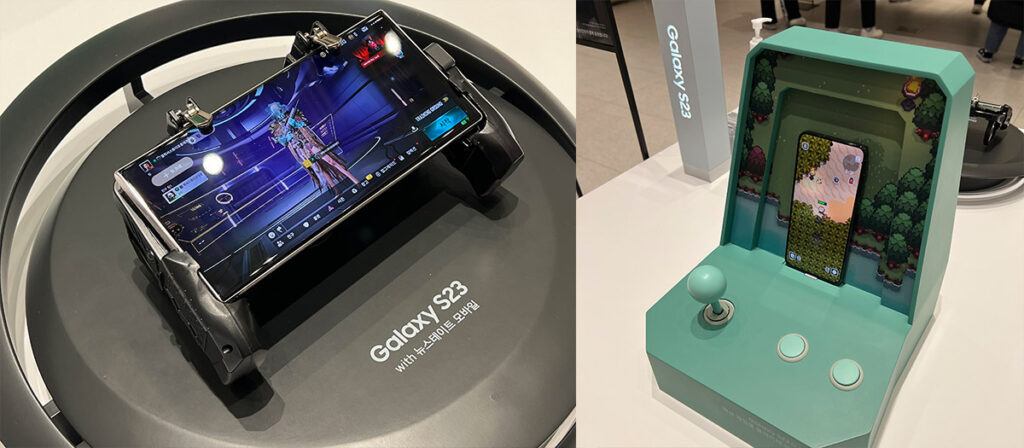 에디터가 방문했던 매장은 삼성전자 서비스 홍대 매장! 매장에는 갤럭시 S23 시리즈로 직접 게임을 즐길 수 있도록 전시해 둔 깜찍한 디바이스들도 만나볼 수 있었는데요. 굉장히 흥미가 당겼으나… 해당 제품은 단순 전시용 디바이스로 아쉽게도 게임 컨트롤러 등의 제품들은 판매하지 않는다고 하니 매장에 직접 방문해 체험해 보는 것을 추천합니다. 워낙 스마트폰으로 모바일 게임을 즐기는 비중이 크다 보니, 삼성전자에서도 그 부분을 특히나 신경써 디스플레이 한 것 같아요.