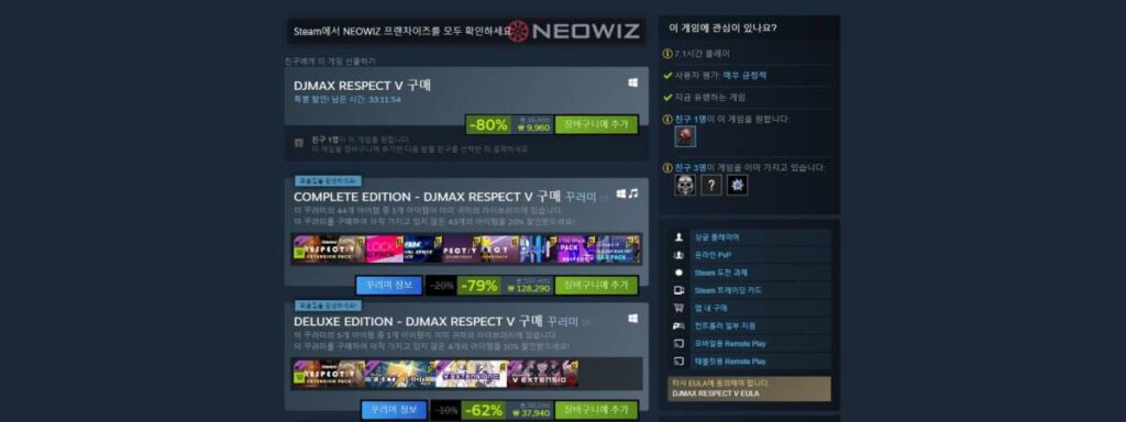 리듬 게임에 추억이 있으신 분들은 이 게임이 정말 좋은 게임이 될 것입니다. 특히, EZ2DJ가 낮은 할인율을 보이는 현 시점에서는 이만한 게임이 없다는 생각이 듭니다. 특별 할인가로 9,960원에 팔리고 있지만 사실 평소에도 할인을 자주 하는 편이기 때문에 진입 자체는 쉽게 할 수 있습니다.