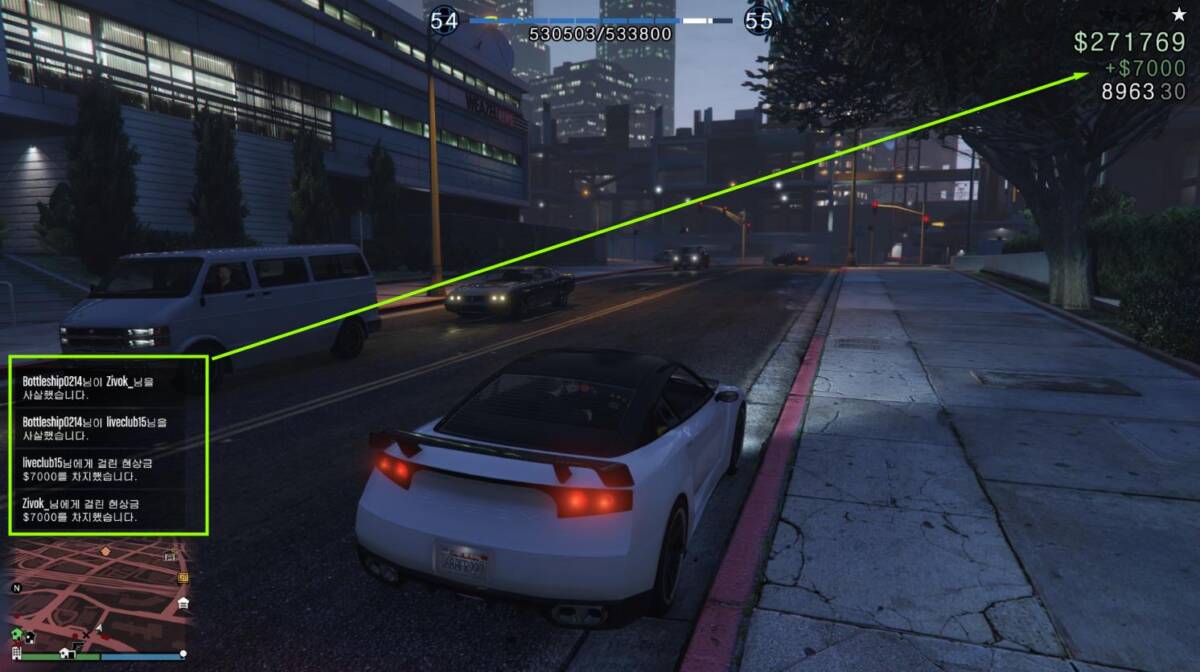 현상금이 딸린 두 명을 처치하는 모습입니다. 까다로운 절차 없이 그저 현상금이 지정된 유저를 사살하면 됩니다. 사살만 하면 되기 때문에 굉장히 접근성이 좋습니다. GTA 온라인에 처음 접했을 때는 지상장비 중 차량이 유일하죠. 때문에 저는 할리우드 인근에서 스포츠카를 이용해서 접근하는 것을 추천합니다.