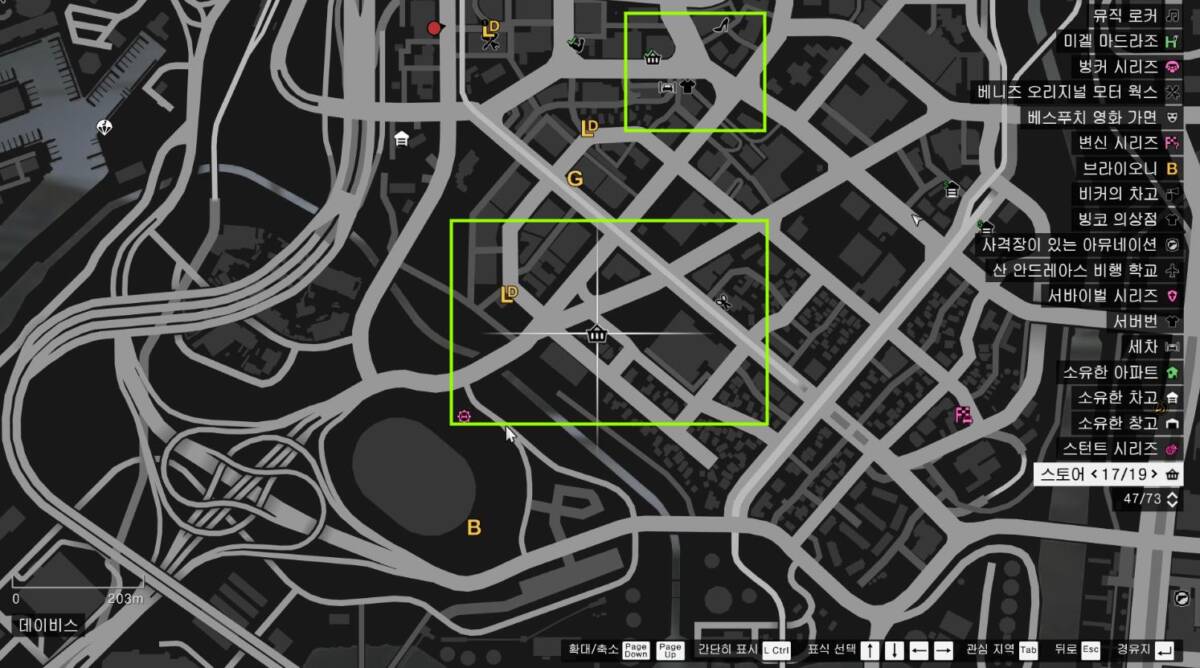 그 다음 쉽게 돈 벌만한 방법은 바로 “편의점 강도” 입니다. 맵에 보면 스토어라고 적혀있는 곳을 보실 수 있습니다. 사진상에서 형광색 상자 안에 있는 마트 표시입니다. 이곳에 가서 캐셔 데스크를 털 수 있습니다. 쉽게 말해, 편의점 강도짓을 하는 것이죠.