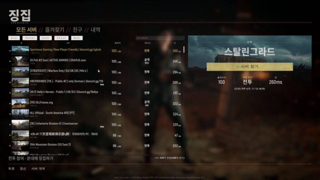 요즘 같은 경우, 할인 시기와 겹쳐 상당히 많은 유저 유입와 더불어 서버 호스팅도 활발하게 이루어지는 편입니다. ‘징집’을 누를 경우 자동적으로 플레이어 수가 많은 순으로 나열되는데요. 그 때문에 핑이 천차만별입니다. 이 때 서버를 고를 때 중요한 점은 핑과 플레이어 수를 잘 보는 것입니다. 이 게임은 핑차가 있어도 생각보다 플레이에 있어서 큰 지장은 없기 때문에 280정도까지 핑은 감수할만합니다.