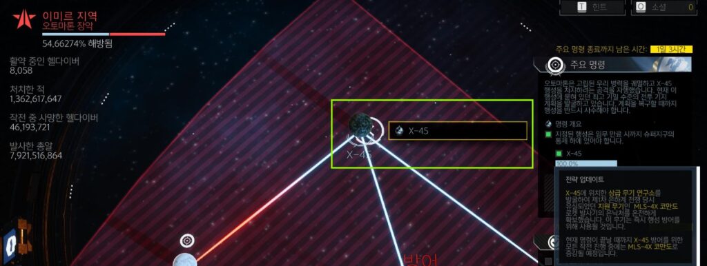 앞서 언급한 것처럼 코만도 미사일 사용을 위해서는 X-45 행성을 가면됩니다. 그런데 문제는 행성이 닫혔다는 것입니다. 헬다이버즈 2 유저라면 다들 아시겠지만, 해방이 필요한 행성을 100% 완료할 경우 다시 입장할 수 없습니다.
