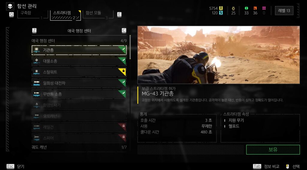 초반에 사용해야 하는 스트라타젬 딱 하나만 정해야 한다면 ‘기관총’만 추천드리도록 하겠습니다. (초반 한정!) 레벨링 하면서 업그레이드 비용을 저축하여 다른 것에 투자하는 게 좋습니다.