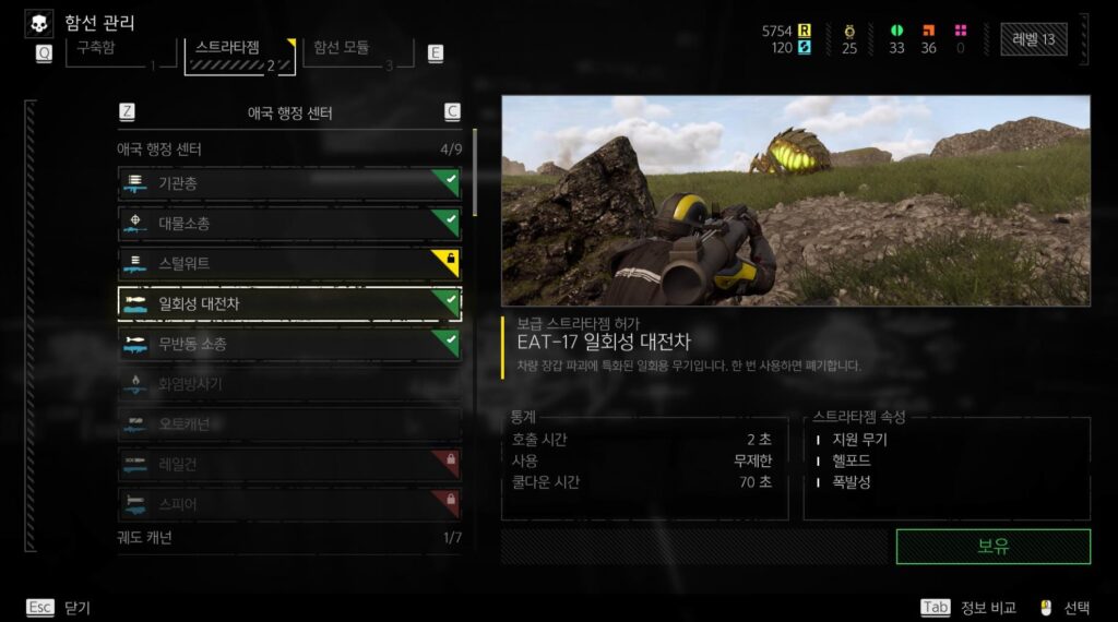 주요 미션지가 어딘지를 따지지 않고, 보급 스트라타젬 중에서 게임의 후반부까지 사용 가능한 것이 무엇이 있냐고 여쭤보신다면 ‘일회성 대전차’를 추천드립니다.