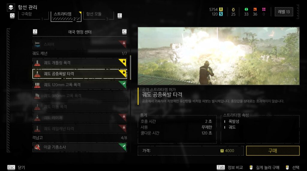 쿨타임도 120초이기 때문에 다른 것들에 비해서는 상대적으로 짧기에 자주 사용할 수 있다는 점도 이점인데요. 120mm 고폭과 같이 범위가 큰 스트라타젬은 아군까지 사살하는 경우가 굉장히 많으니 궤도 스트라타젬은 개틀링, 공중폭발 선에서 머무는 것을 추천드리고 추후 레벨 수준이 가능할 때 궤도 레이저는 사용하시는 걸 적극 추천드립니다.