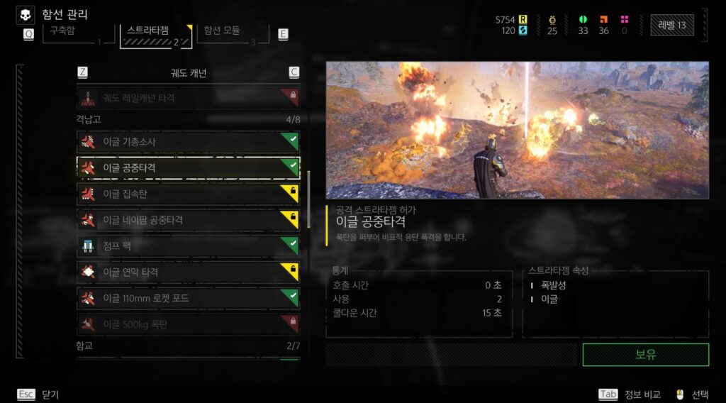 이글은 공중타격부터 사용하시는 걸 추천드리는데요. 기총소사 같은 경우 화력과 데미지 모두 약한 면이 있기 때문에 추천드리지 않습니다. 또한, 집속탄, 로켓 포드, 500kg 폭탄도 훌륭한 화력을 보이는데요. 네이팜 공중타격도 좋지만 자칫하면 미션에 지장을 주기 쉽기 때문에 적극적으로 추천하기에는 곤란한 면이 있습니다.