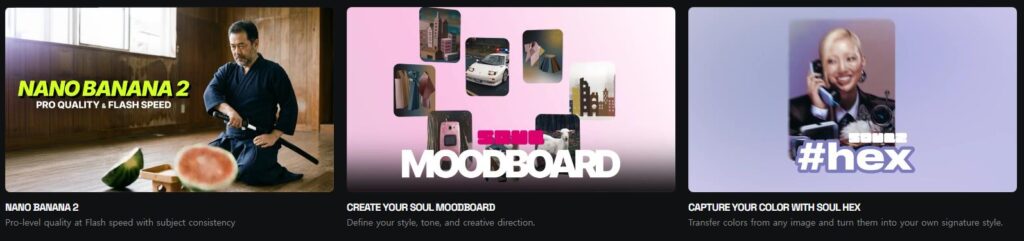 Moodboard는 레퍼런스 이미지를 모아 톤/스타일/방향성을 정리하는 보드용. Soul Hex는 이미지에서 컬러를 뽑아 ‘내 시그니처 색’처럼 옮기는 컬러 전이(transfer) 계열입니다.