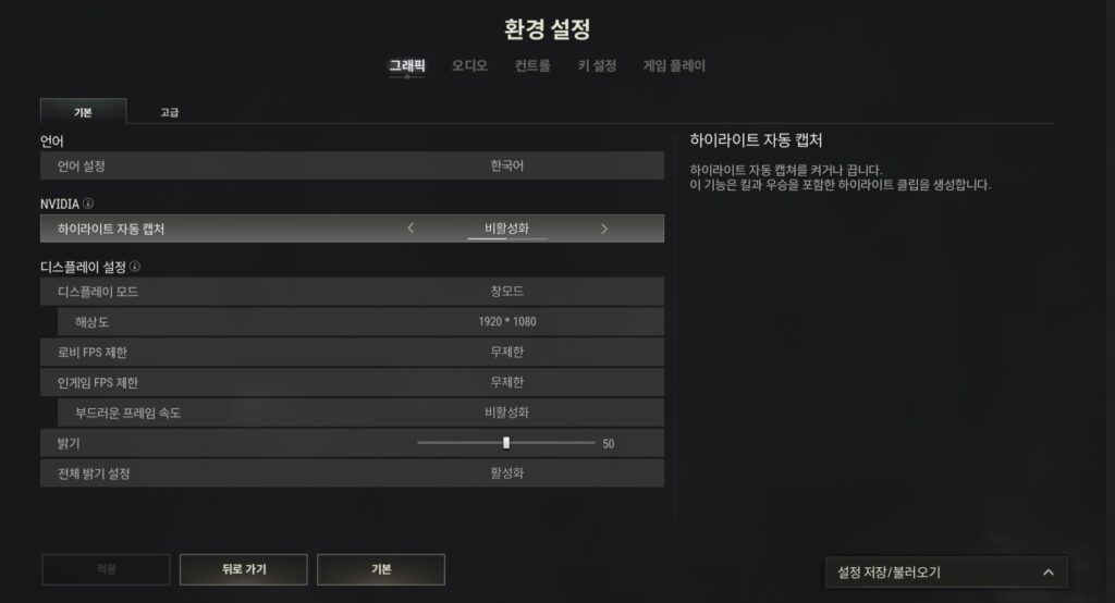 고사양 PC인 경우라면 상관없지만 조금이라도 애매한 사양이라면 해당 사양을 끄시는 것이 프레임 방어에 도움이 됩니다.
