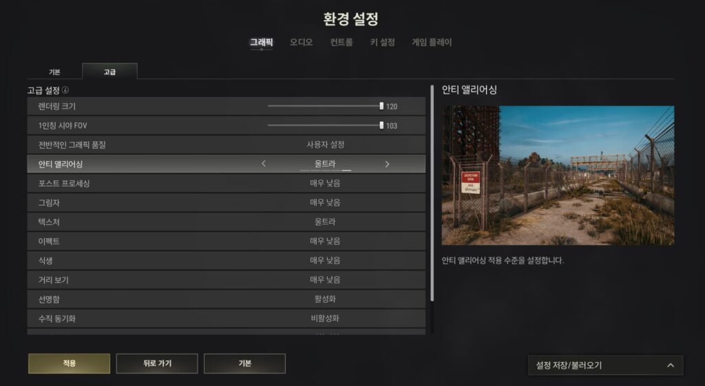 사양에 따라서 허용되는 한, 최대한 안티 앨리어싱을 높게 잡아주는 것이 배틀그라운드 설정에 있어서 이점이 될 수 있습니다.