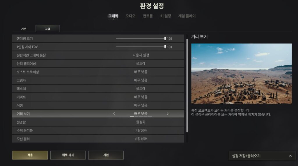 이러한 근거는 배틀그라운드 뿐만 아니라 다른 게임들의 선수들의 세팅값을 보아도 알 수 있어요. 대체로 선수들은 최상의 프레임을 얻기 위해서 모든 옵션을 낮추는 경우가 많습니다. 그렇기에 배틀그라운드 설정도 동일하게 전반적인 그래픽 품질을 ‘매우 낮음’으로 해주는 게 좋습니다.