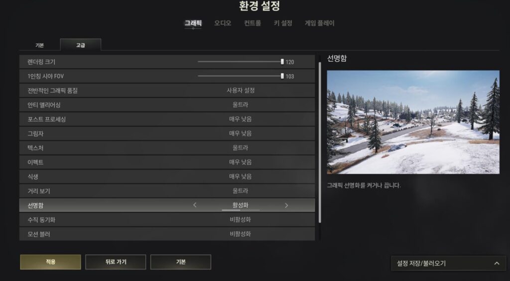 선명함은 말 그대로 화면 상에 나타나는 시각적인 정보들이 조금 더 선명하게 나타나게끔 해주는 설정입니다. 배틀그라운드 설정에 있어서 필수적인 요소는 아니지만 이를 통해 적지 않게 도움을 받는 유저들도 있습니다.