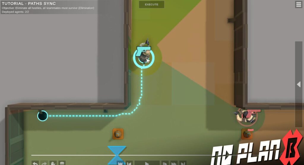 이 게임은 타임라인안에서 각 캐릭터들을 어떤 동선을 갖게 할 것인지, 문을 돌파하기 위한 수단은 무엇을 이용할 것인지, 투척류는 사용할 것인지 등 다양한 디테일을 고려하게끔 되어있습니다. 그 뒤, 타임라인을 재생하면 여러분이 계획했던 것들이 순차적으로 이루어지는 것을 보는 방식의 게임입니다.