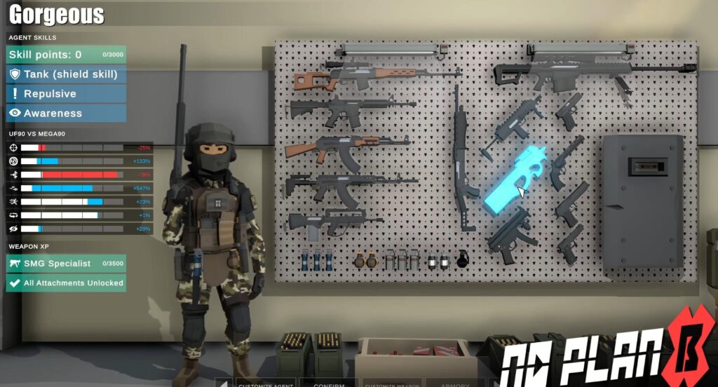 전술이 강조되는 신작게임 중에서 커스터마이징이 빠진 게임은 못본 것 같습니다. 오늘 추천드리는 인디게임 노 플랜 비 역시 마찬가지입니다. 캐릭터들의 피부색과 상하의 등은 물론, 헬맷, 마스크, 전면 파우치, 전면 패치, 전면 왼쪽부 파우치, 전면 오른쪽 파우치 등 사소한 것들까지도 입맛에 따라 맞출 수 있습니다.