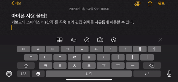 키보드의 간격(스페이스바) 버튼을 꾸욱 누른 상태로 텍스트 편집 위치를 자유롭게 이동할 수 있다. 타이핑 도중 이전 내용을 삭제/편집할 때 짱 편리! 수정할 위치를 정확히 터치하기 어려울 때도 짱 편리!