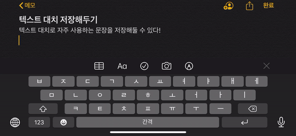 설정의 일반>키보드>텍스트 대치 화면에서 자주 사용하는 문장을 미리 저장해둘 수 있다. 매일 자주 사용하는 문장(지금 출발합니다! 등)을 저장해두면 더 편리하게 편리함!