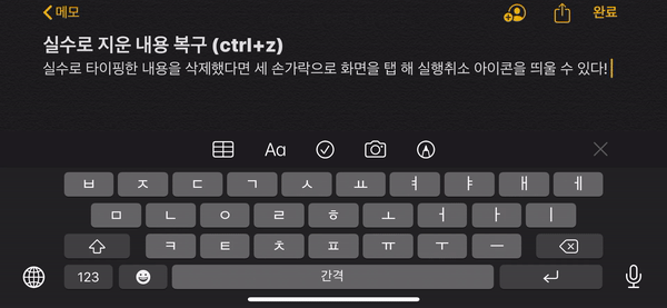 텍스트 타이핑 도중 실수로 내용을 지웠거나 할 경우, 세 손가락을 탭 하는 것만으로 뒤로가기 버튼을 불러낼 수 있다! 각 앱마다 지원 여부가 다르지만 일단 카톡에서는 이용 가능!