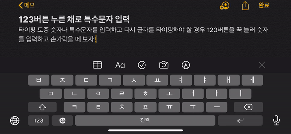 텍스트 타이핑 도중 키보드의 123 버튼을 꾸욱 탭한 상태에서 빠르게 숫자를 입력한 뒤 손을 떼는 것으로 다시 한글(영어도) 키보드로 돌아갈 수 있다! 문장 중간에 숫자나 특수문자를 입력해야 할 때 유용!